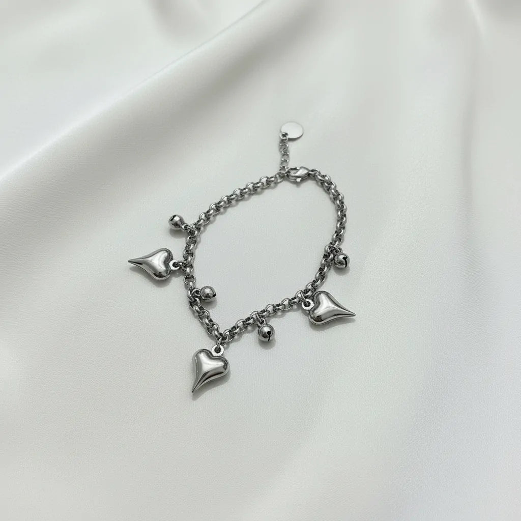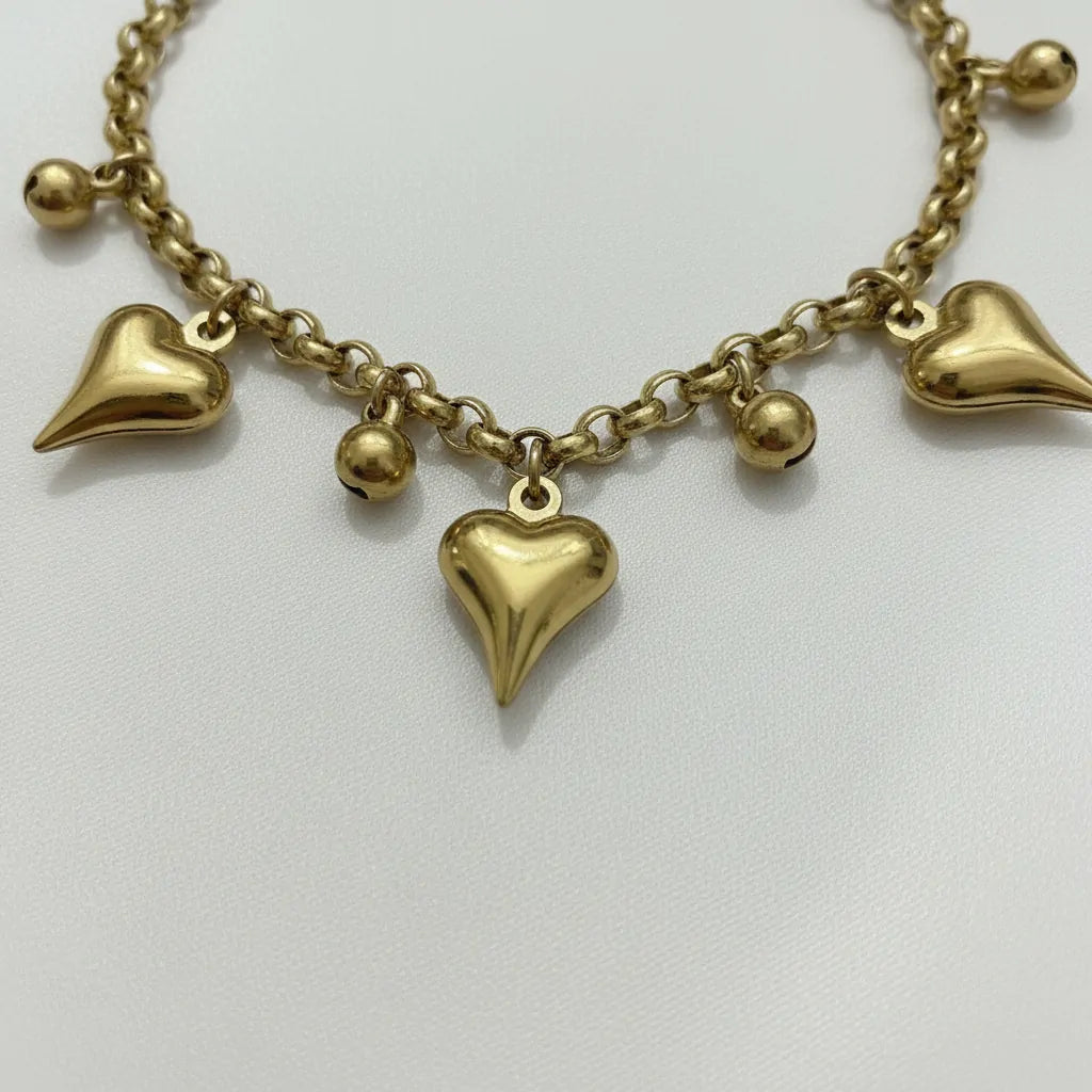 Esprimi la tua personalità con il nostro Bracciale con Charms Cuore in Acciaio Oro. Questo gioiello non è il classico bracciale sottile: la sua catena a maglia tonda e robusta sostiene tre splendidi cuori pendenti dal design 3D (bombati), alternati a piccole sfere lucide che creano un movimento armonioso e un suono delicato ad ogni tuo gesto.