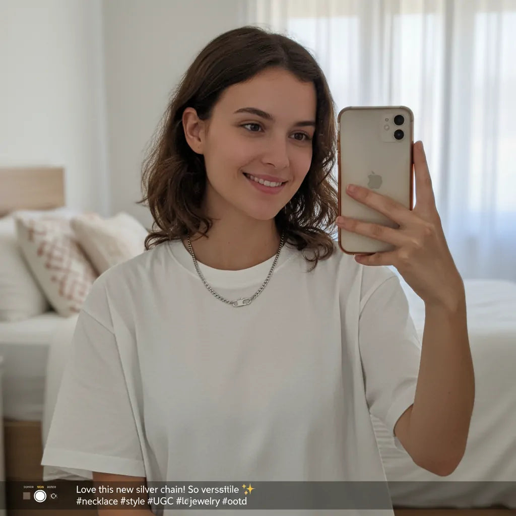 Look "Classico" (Minimal): Vuoi un effetto più sobrio? Ruota la collana e porta il moschettone dietro al collo. Avrai una splendida catena intrecciata a maglia spiga, semplice ed elegantissima, perfetta per l'ufficio o look formali.