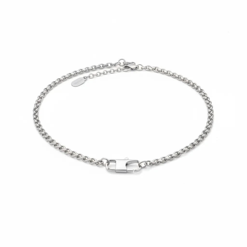 Questa collana in maglia Spiga intrecciata stravolge le regole classiche: la chiusura non si nasconde più, ma si mostra con orgoglio. Il protagonista è il moschettone geometrico di design, pensato per essere portato sul davanti come punto luce moderno e audace.