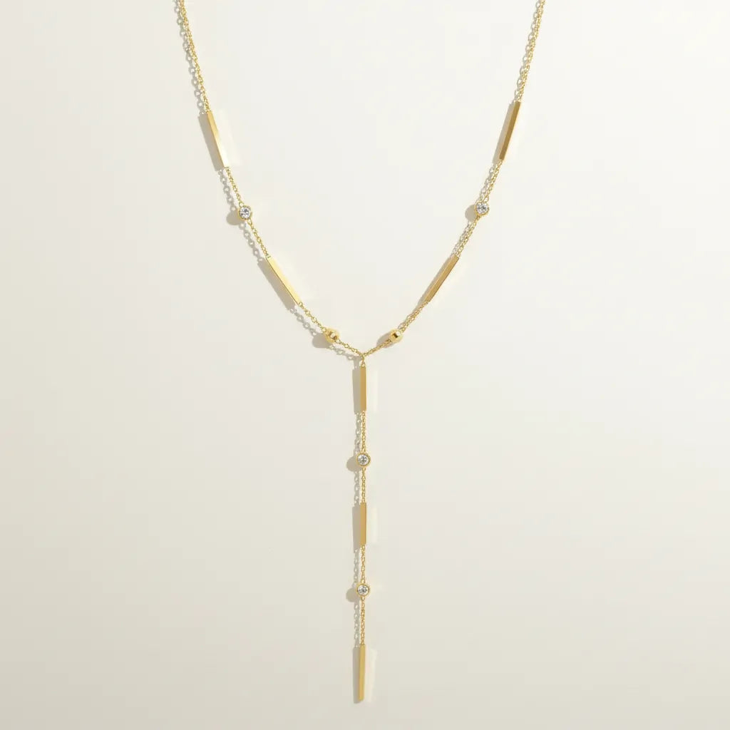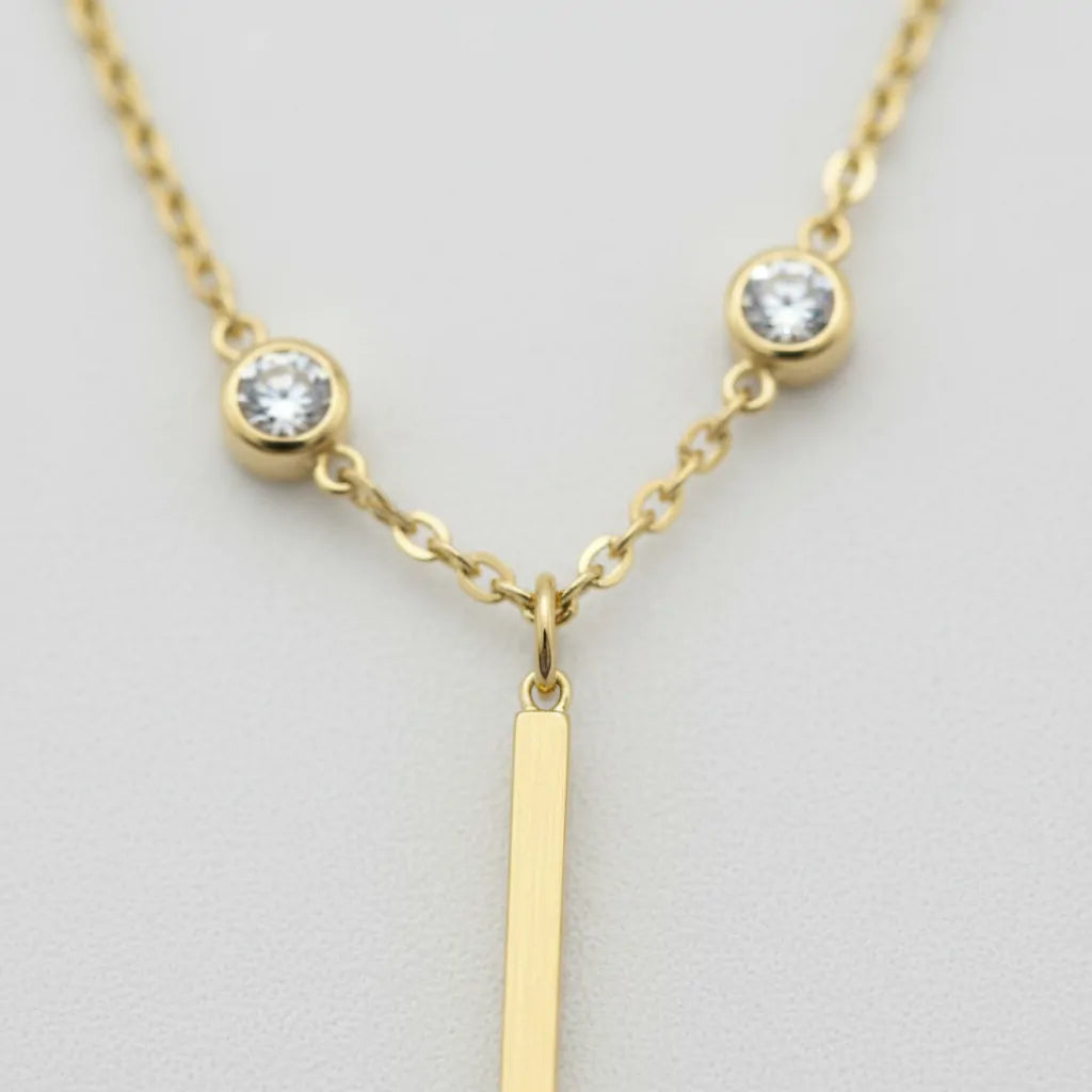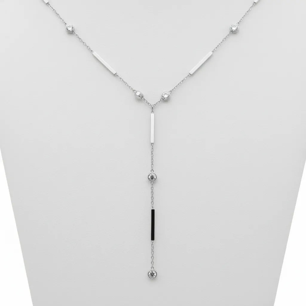 Scopri il fascino della semplicità con la nostra Collana a Y Geometrica. Questo gioiello si distingue per il suo design pulito e raffinato, dove sottili barrette dorate si alternano a brillanti punti luce in zircone lungo tutta la catena e sul pendente verticale.