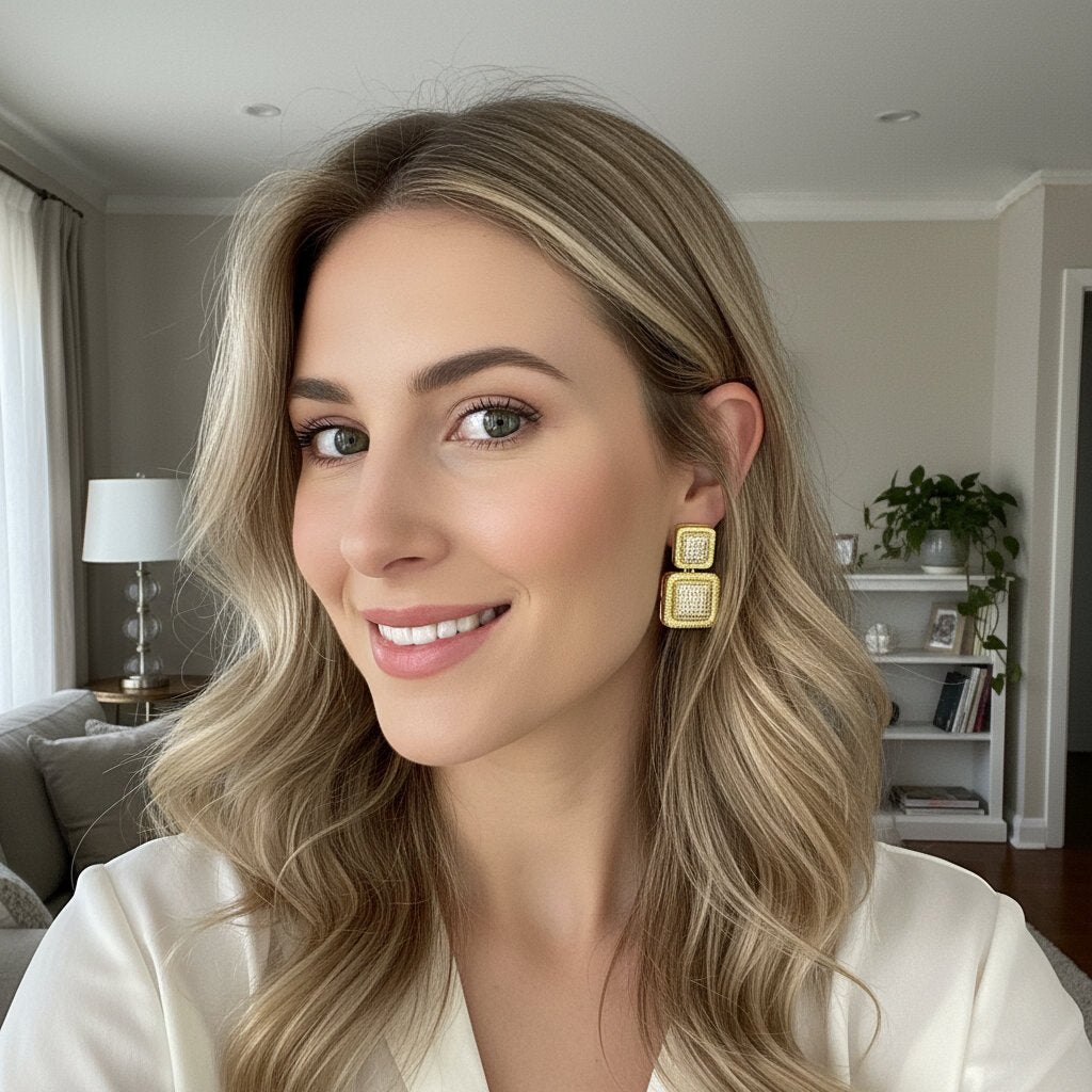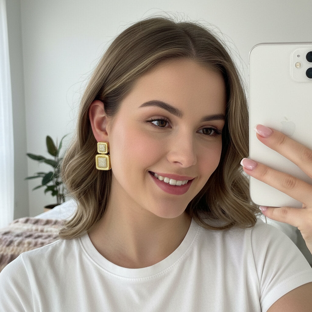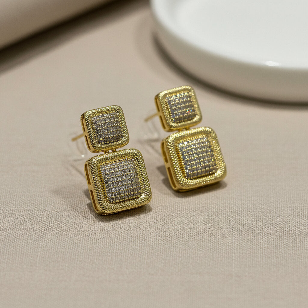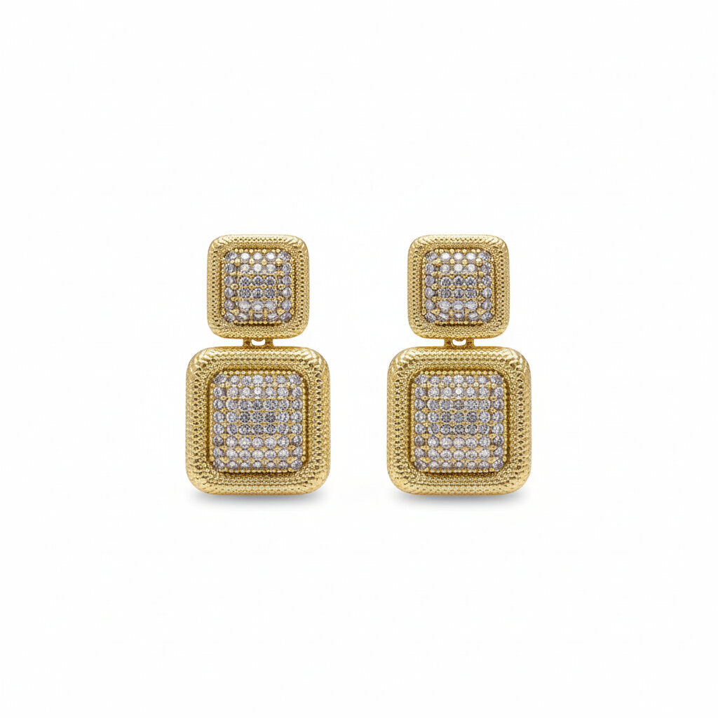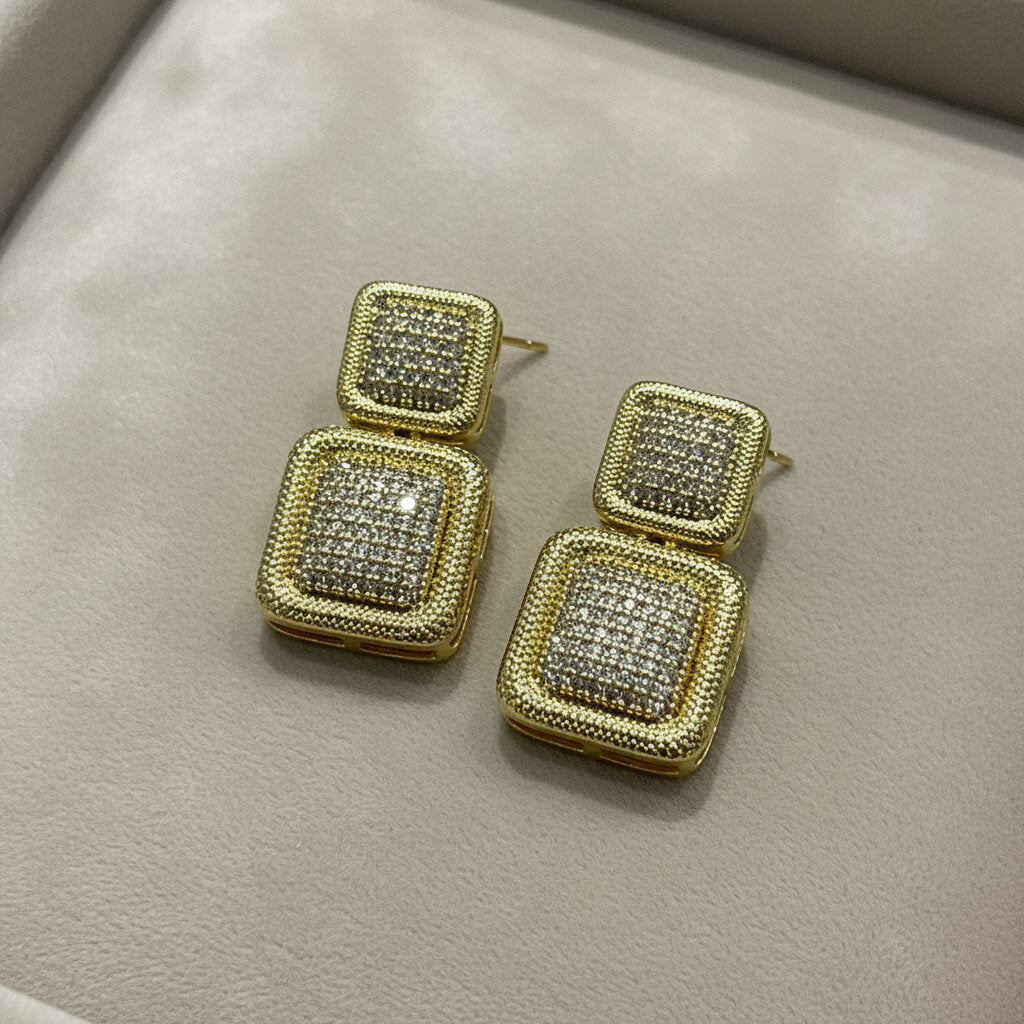 Eleganza geometrica e massima lucentezza si incontrano in questi orecchini a lobo dal design moderno. Composti da due elementi quadrati sovrapposti con finitura dorata e un ricco pavé di luce centrali, questi gioielli catturano la luce ad ogni movimento. Perfetti per chi ama gli accessori bold ma sofisticati, sono l'ideale per completare un outfit da sera o per dare luce a un look formale.