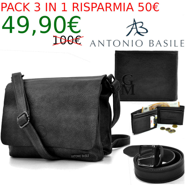 Pack 3in1 Tracolla A.BASILE uomo nero + portafoglio + cintura vera pelle italy