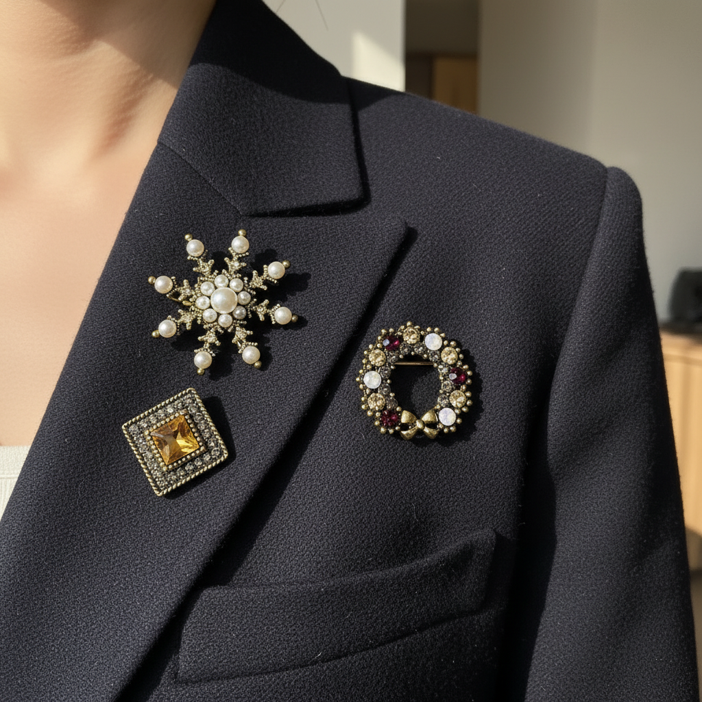 Set raffinato di 3 spille donna in stile vintage-chic, perfette per aggiungere un tocco elegante e femminile agli outfit. Include: una spilla a stella/fiocco decorata con perle e cristalli effetto cammeo, una spilla a ghirlanda rotonda con cristalli multicolore e fiocchetto dorato, e una spilla quadrata con cristallo centrale ambra e bordo di strass. Realizzate in metallo placcato oro con finitura lavorata, perle sintetiche e strass lucenti, sono leggere, robuste e facili da fissare su giacche, blazer, cappotti, sciarpe, borse e maglieria. Ideali per cerimonie, matrimoni, eventi serali o come regalo elegante per lei.