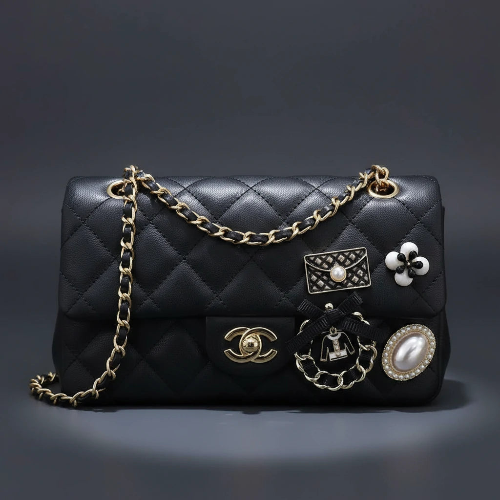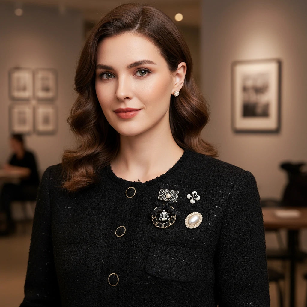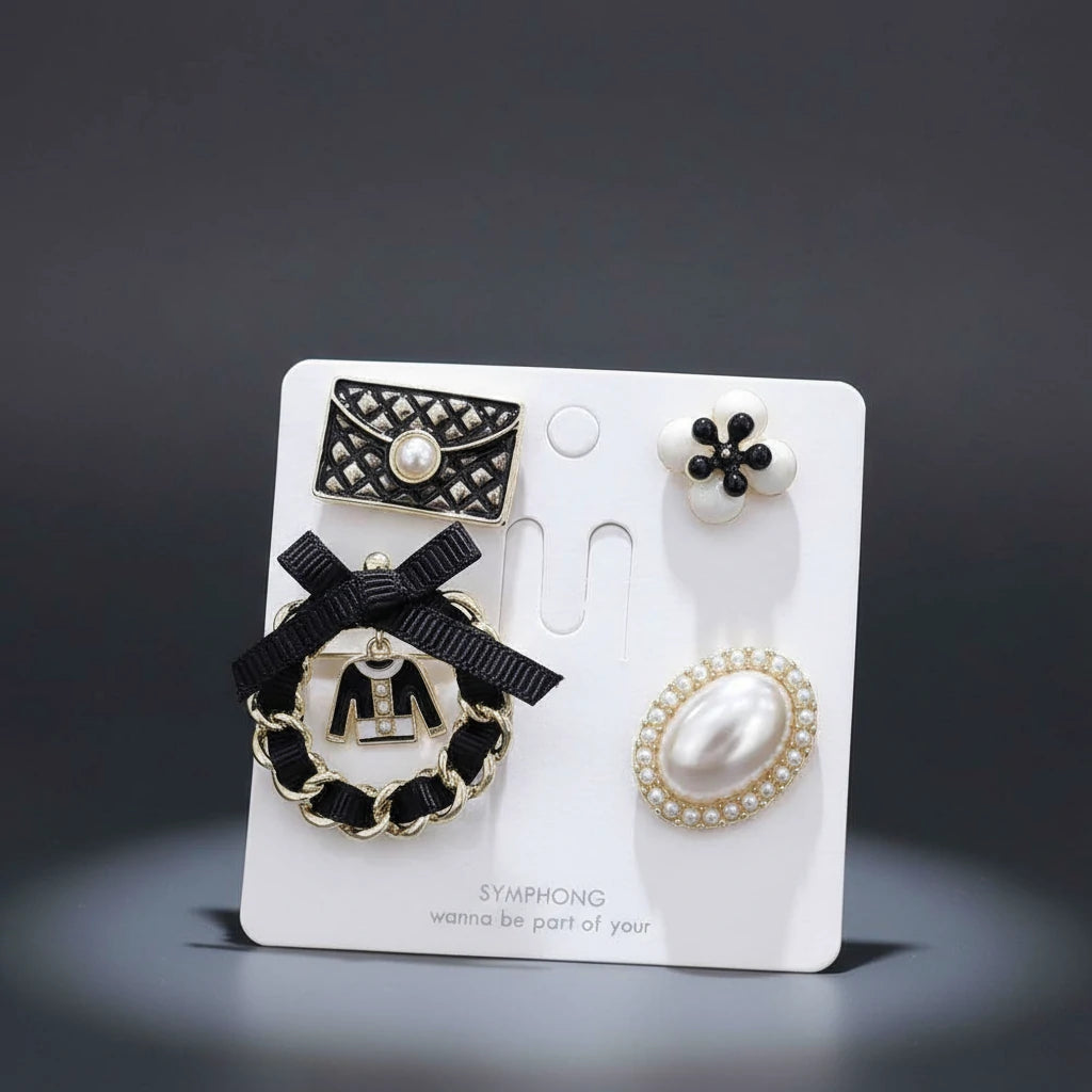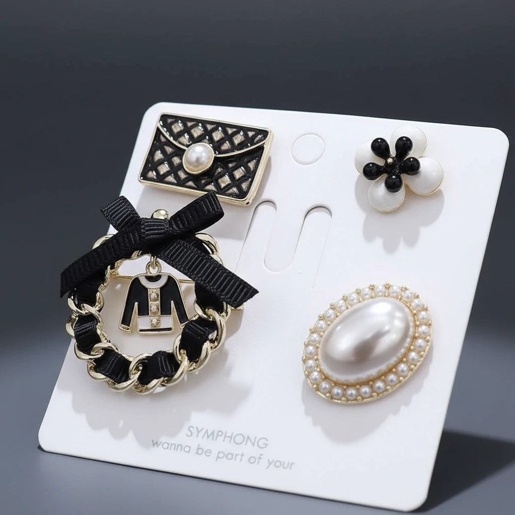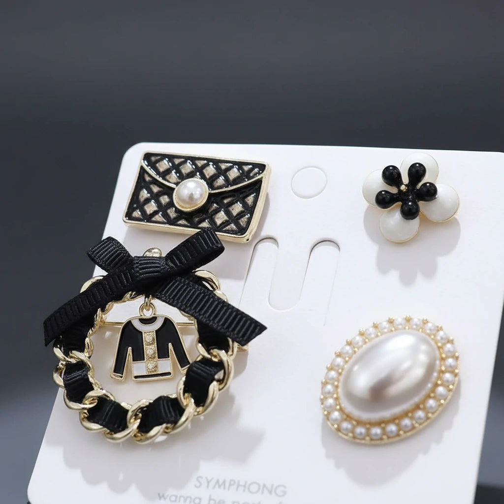 Dona un tocco sofisticato e femminile ai tuoi outfit con questo set di spille da donna in stile vintage-chic. Ogni spilla è rifinita in metallo placcato oro con dettagli smaltati nero e bianco, perla centrale e charm a forma di borsetta e giacchina; comprende anche un elegante cabochon ovale con bordo di perle e un fiore gioiello. Perfette su blazer, cappotti, sciarpe e borse, queste spille fashion sono ideali per look da giorno e serali, matrimoni e regali speciali. Design raffinato, leggere e facili da applicare, ottime come idea regalo per lei.